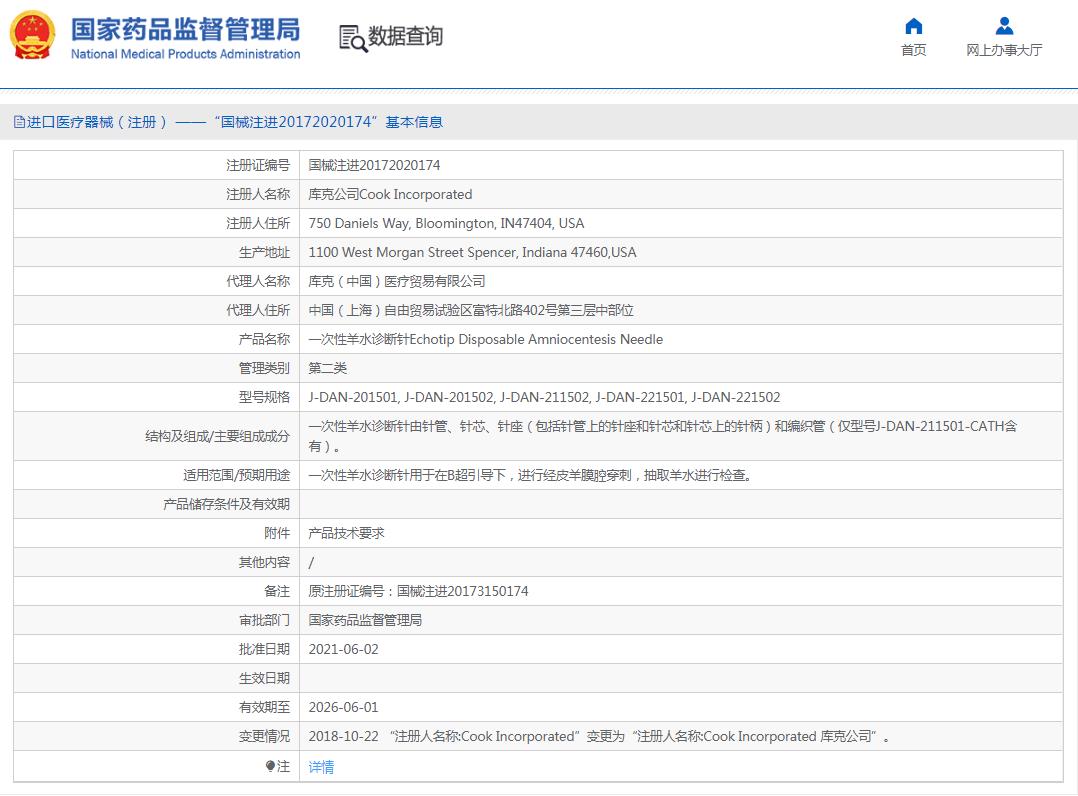 穿刺针 注册证编号:国械注进20172020174