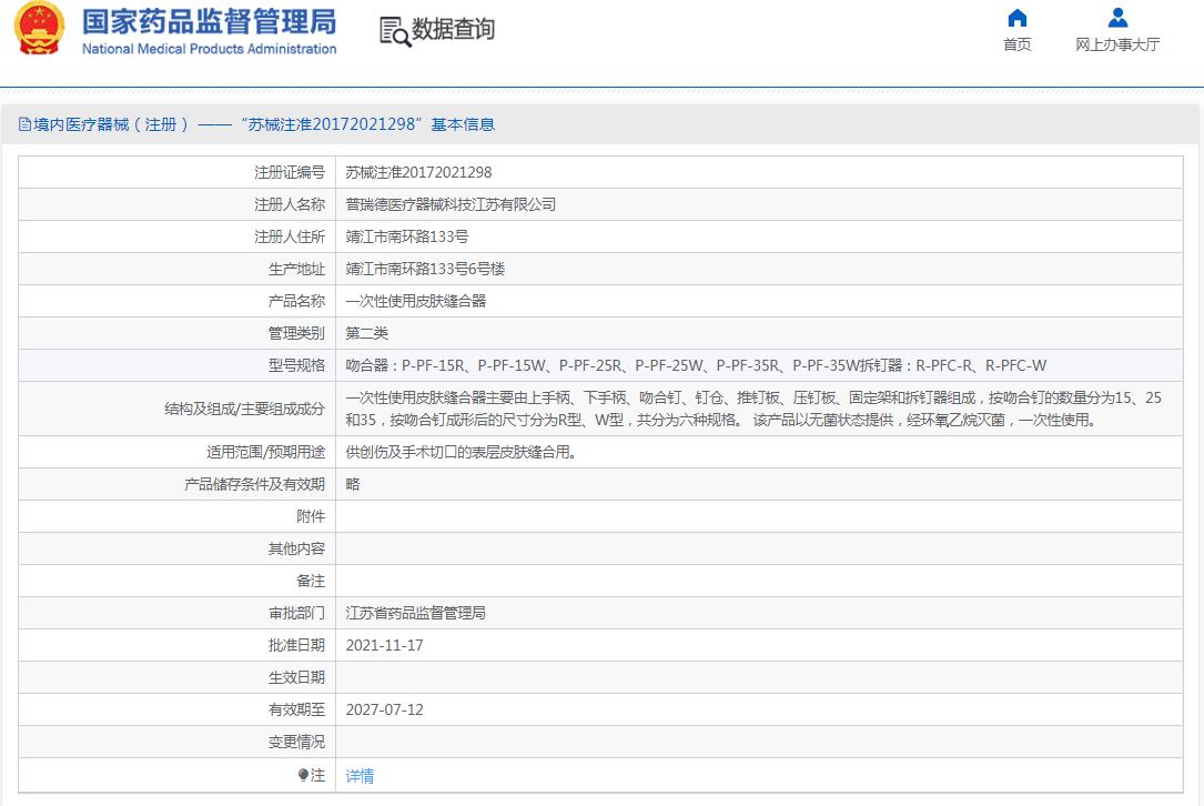 皮肤缝合器 注册证编号:苏械注准20172021298
