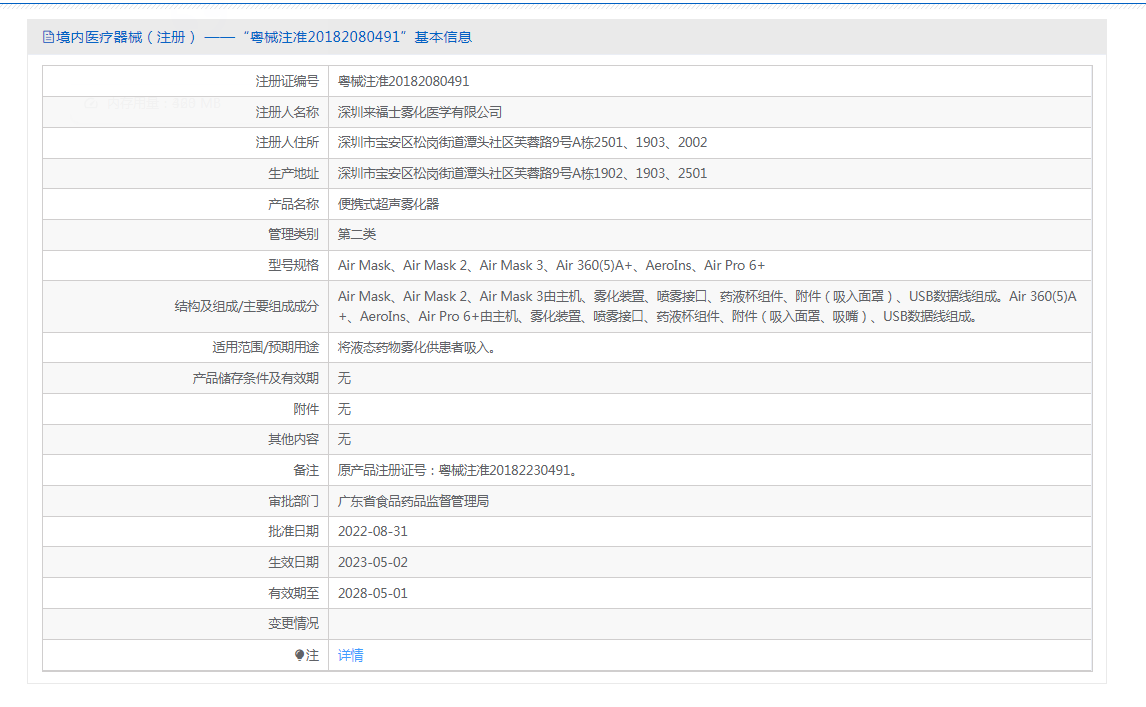 雾化器 注册证编号:粤械注准20182080491